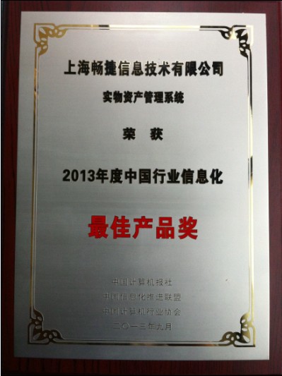 上海暢捷信息技術有限公司憑借實物資產管理系統的獨創性和先進性脫穎而出,一舉榮獲“2013年度中國行業信息化實物資產管理系統最佳產品獎”