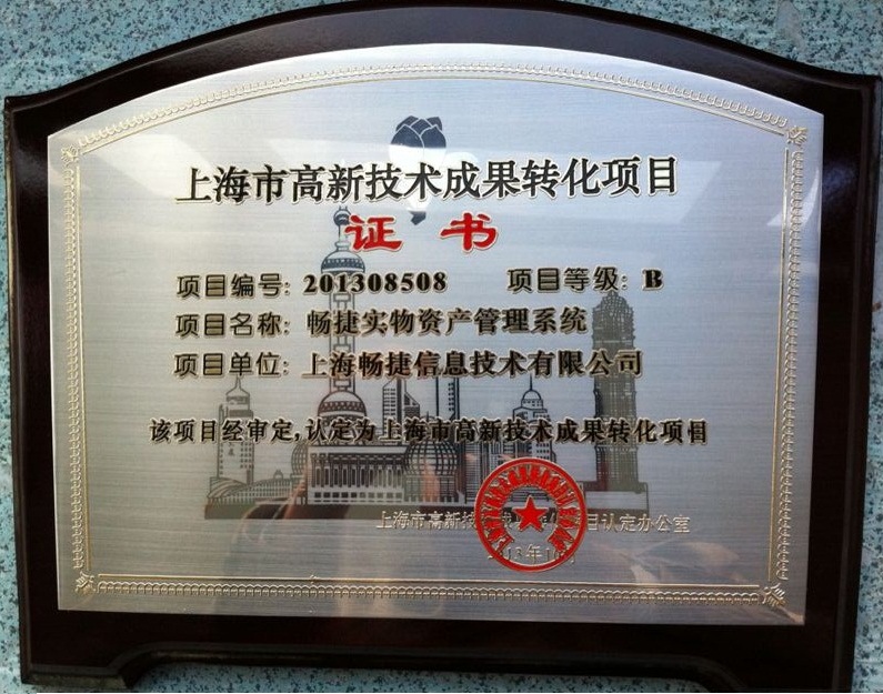 2013年10月,上海暢捷固定資產管理系統項目榮獲由上海市高新技術成果轉化項目認定辦公室頒發的《上海市高新技術成果轉換項目》榮譽證書。